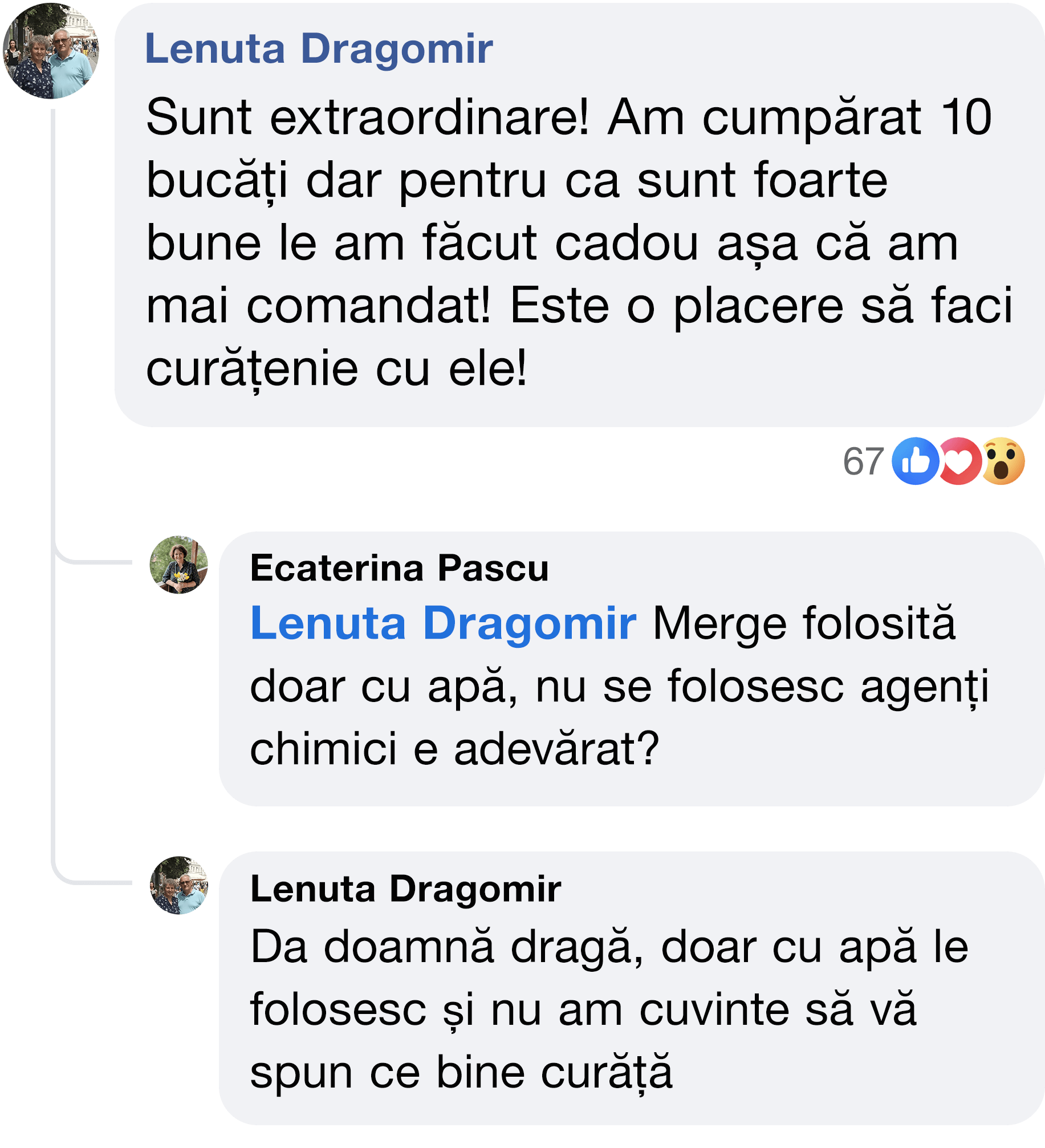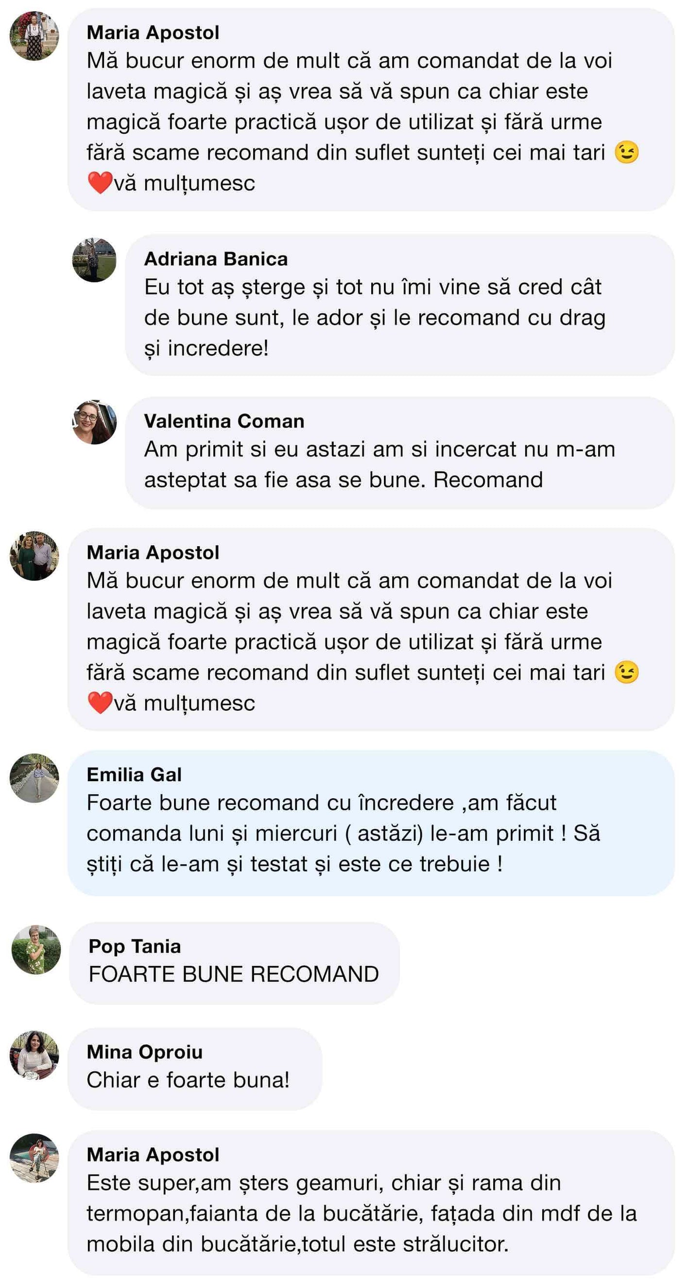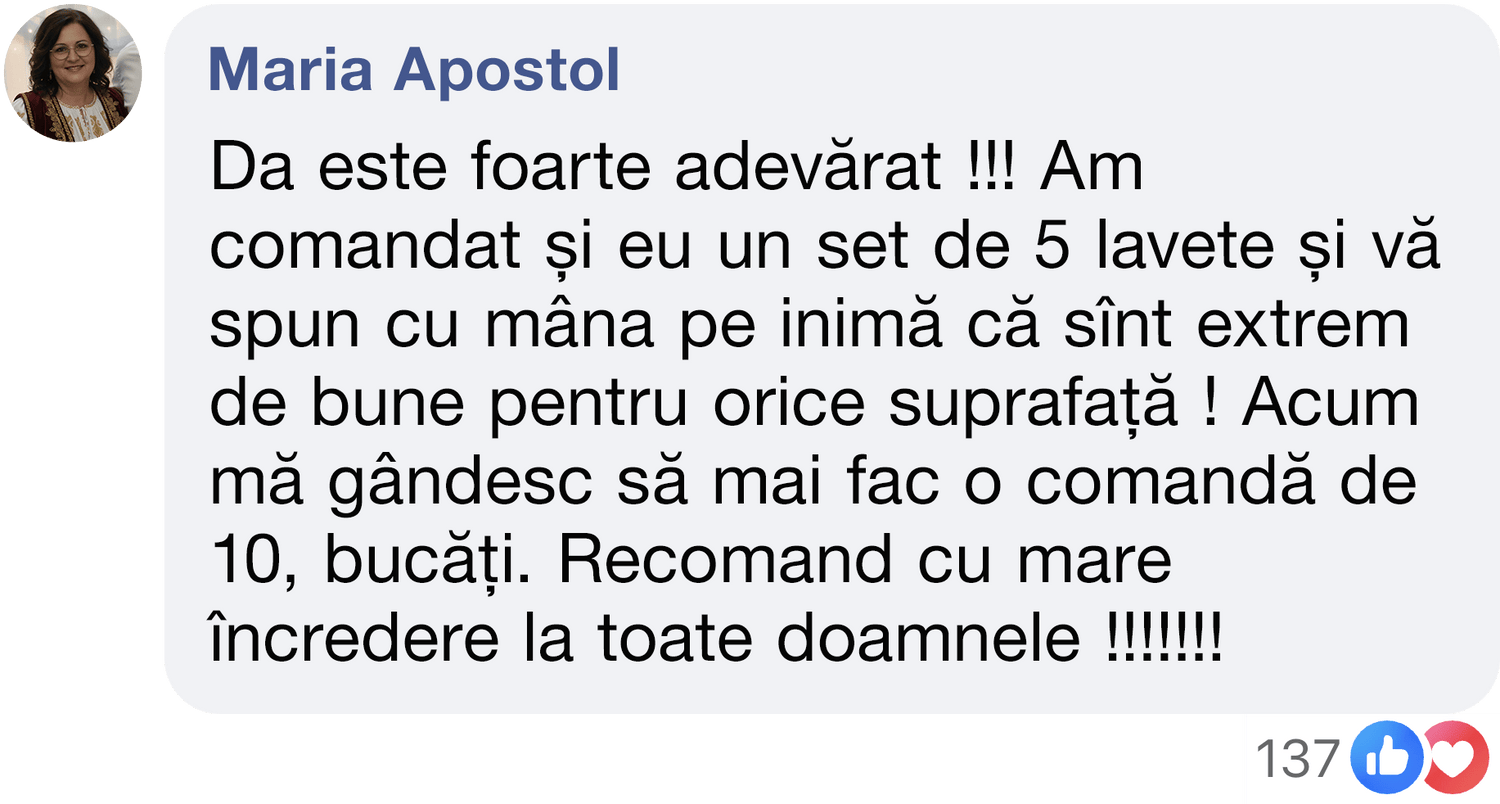 Mulțumiri speciale doamnei Gabriela Cristea, clientă fidelă Ecolino, care folosește cu regularitate Laveta Magică și o recomandă din toată inima.